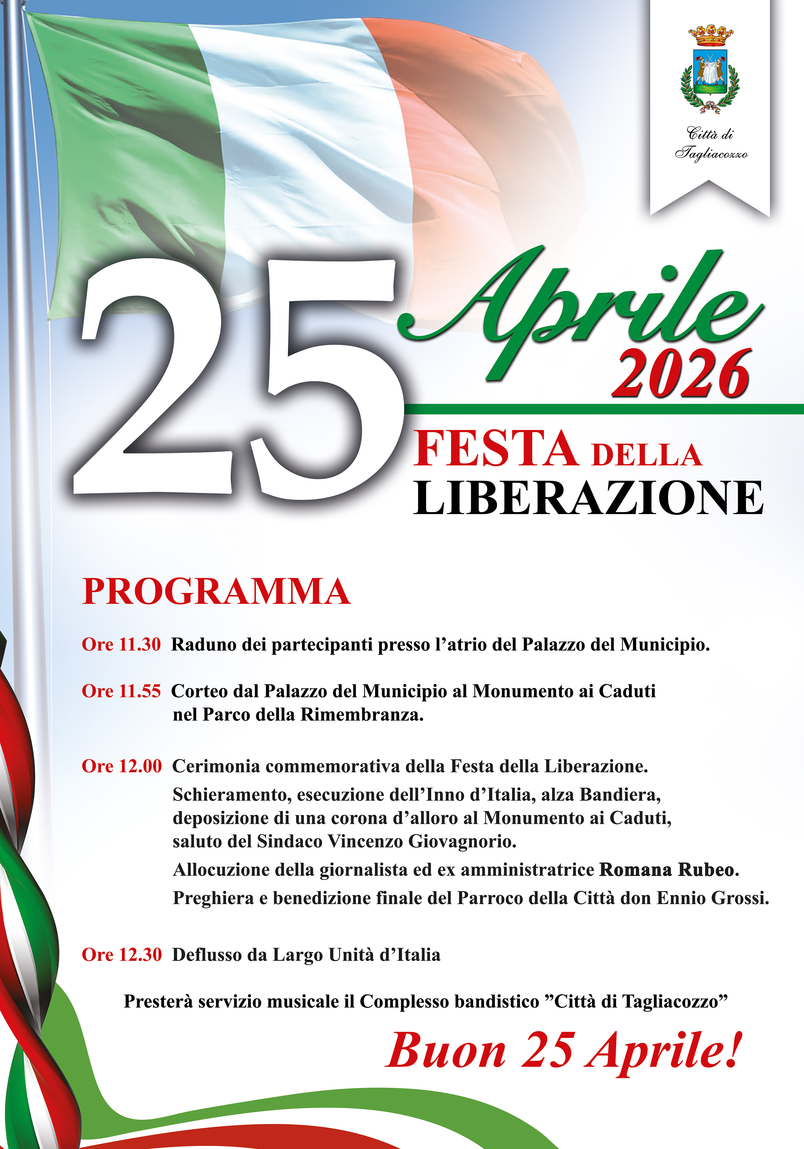 Il Comune della Città di Tagliacozzo invita tutta la cittadinanza a partecipare alla cerimonia commemorativa per celebrare il 𝟐𝟓 𝐀𝐩𝐫𝐢𝐥𝐞, giornata simbolo di libertà, democrazia e memoria.